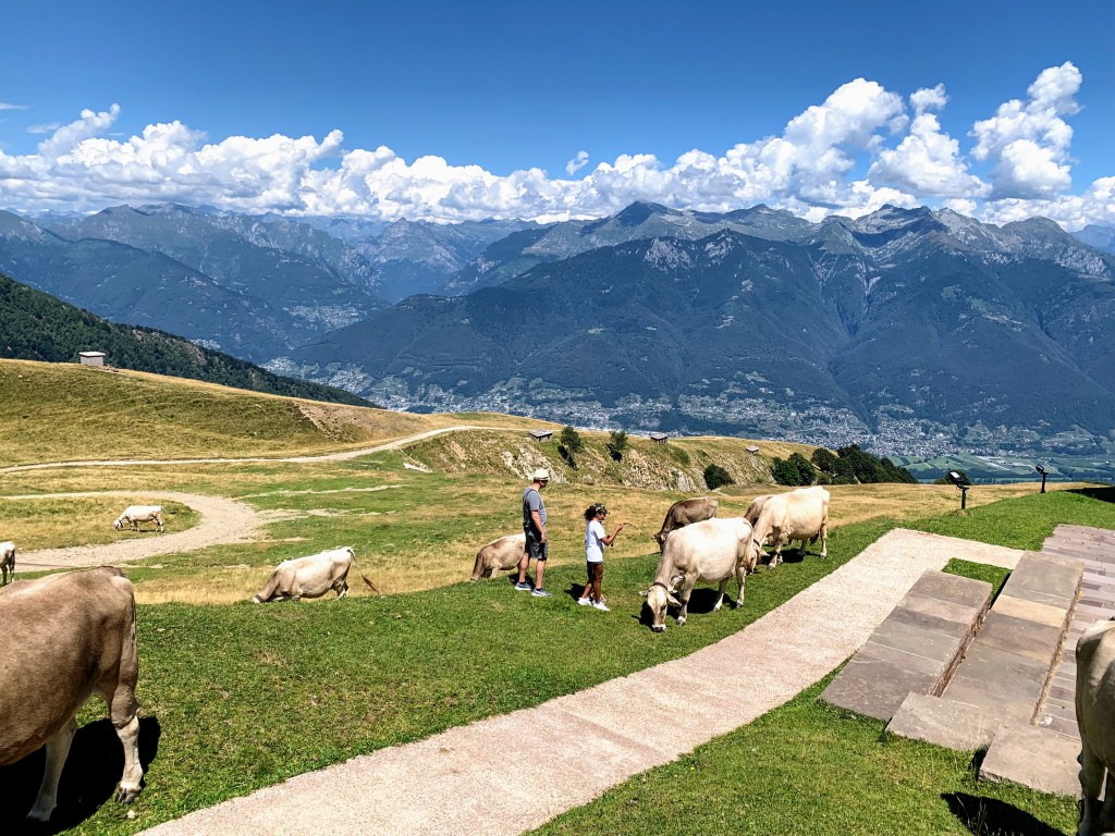 Our first full day was at Monte Tamaro. We zoomed down the mountain on an alpine coaster, saw some stunning views while zip lining and our 7 year old played in one of the most beautifully situated playgrounds we’ve ever seen. Then the mountain cows came by for a visit and I’m a little surprised at how much fun it was to hear their music and watch the kids playing with them.