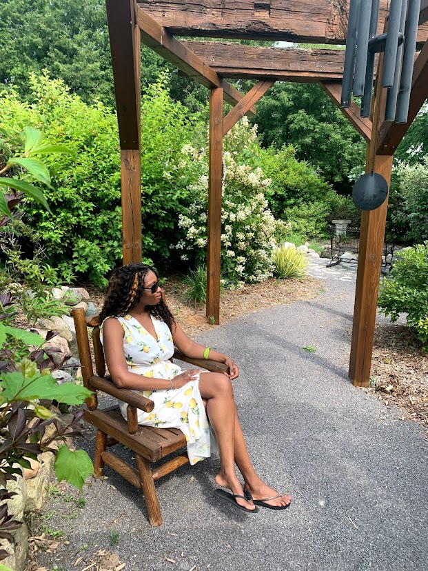 Joy is sitting in one of the little hammocks inside a little gazebo, looking up at the trees and sky with a good book or the one you love.