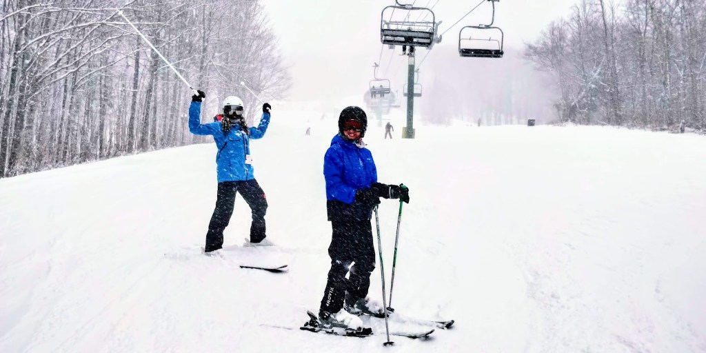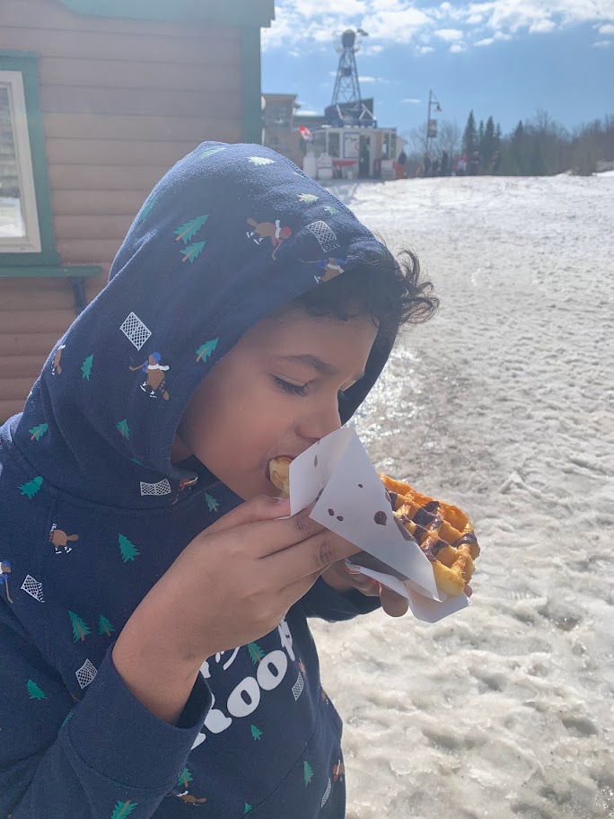 Burke Mountain Resort is a small ski resort, and the focus is on skiing. I love that there is only one main lift, so we didn’t have to search for each other at the bottom. My son & I are different levels, but we wanted to ski together; at Burke, we took the same lift up and then took a different trail down, meeting up in the middle to check in and then continuing down. The glades here were great for my son, who could weave in and out of the forest, meeting up with me at different times. Even though we were doing different runs, it still felt like we were skiing together. I felt comfortable that I knew where he was at all times and didn’t have to worry about him accidentally going down the wrong trail and ending up in a different location than me. We got a powder day while there, which was just total bliss. We were worried about the weather because the temperatures kept fluctuating, and we weren’t sure if all the snow would melt by the time we got there; needless to say, I’m really glad we went.