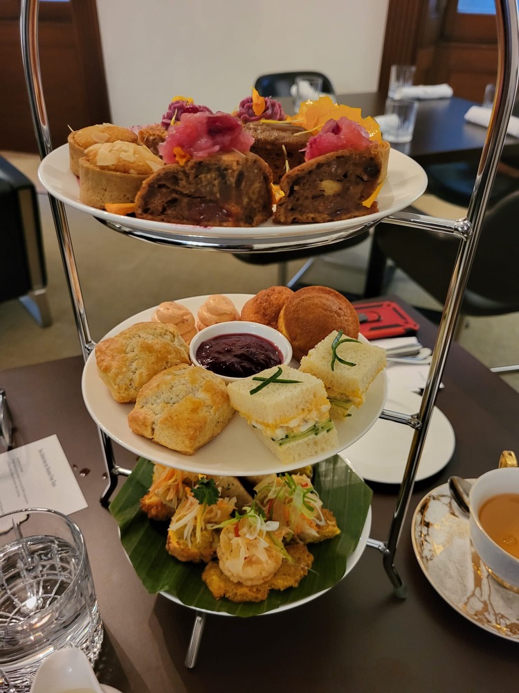Rather than the conventional bite-sized sandwiches, guests are treated to a curated selection of delicacies served on a three-tiered tray. Two preset menus are available—one vegetarian and the other regular—each featuring an assortment of delectable treats inspired by Caribbean and British cuisines. Drawing influences from Jamaica, Guyana, Trinidad and Tobago, Grenada, Barbados, and the UK, the menu promises a culinary journey like no other.