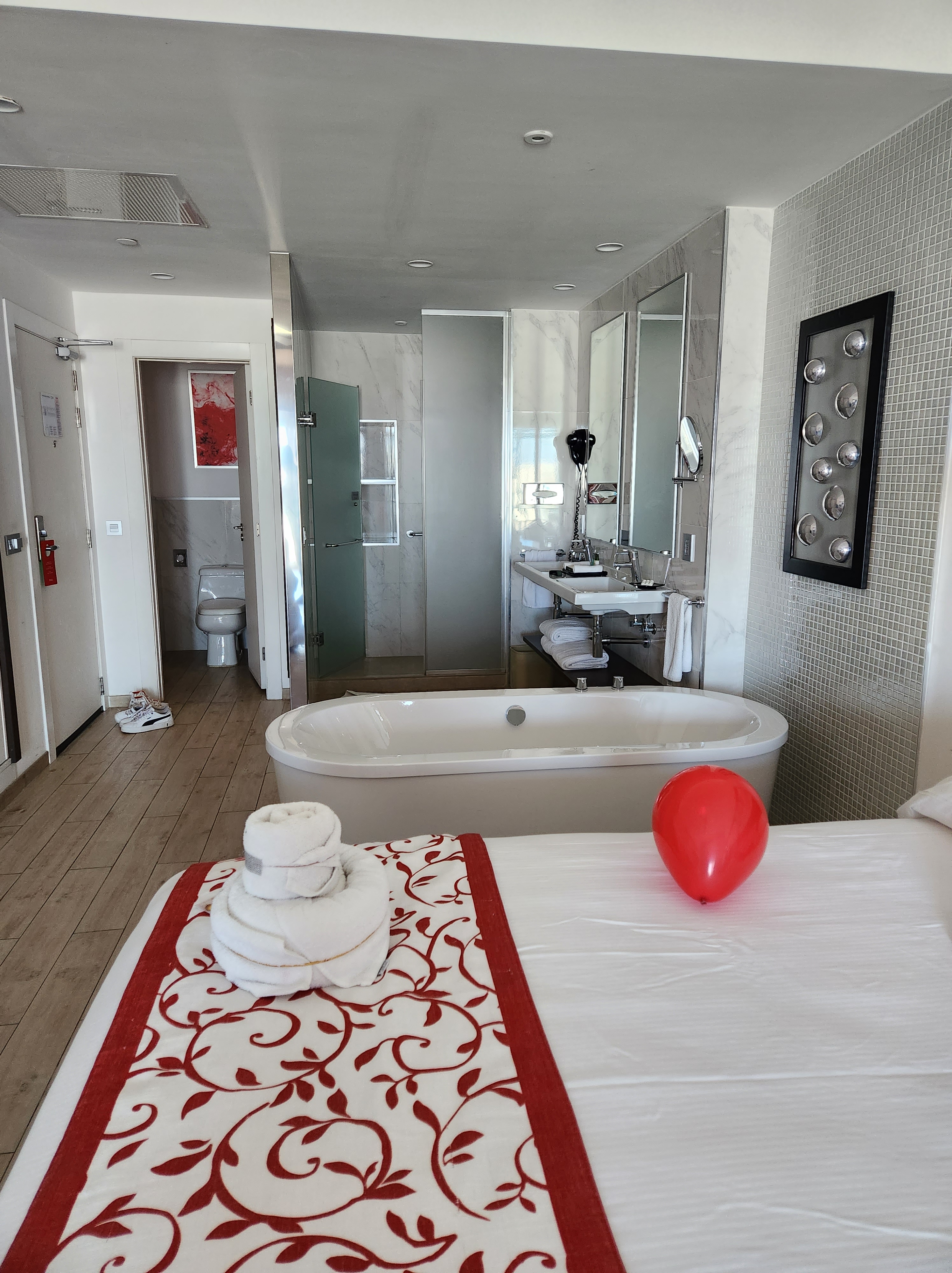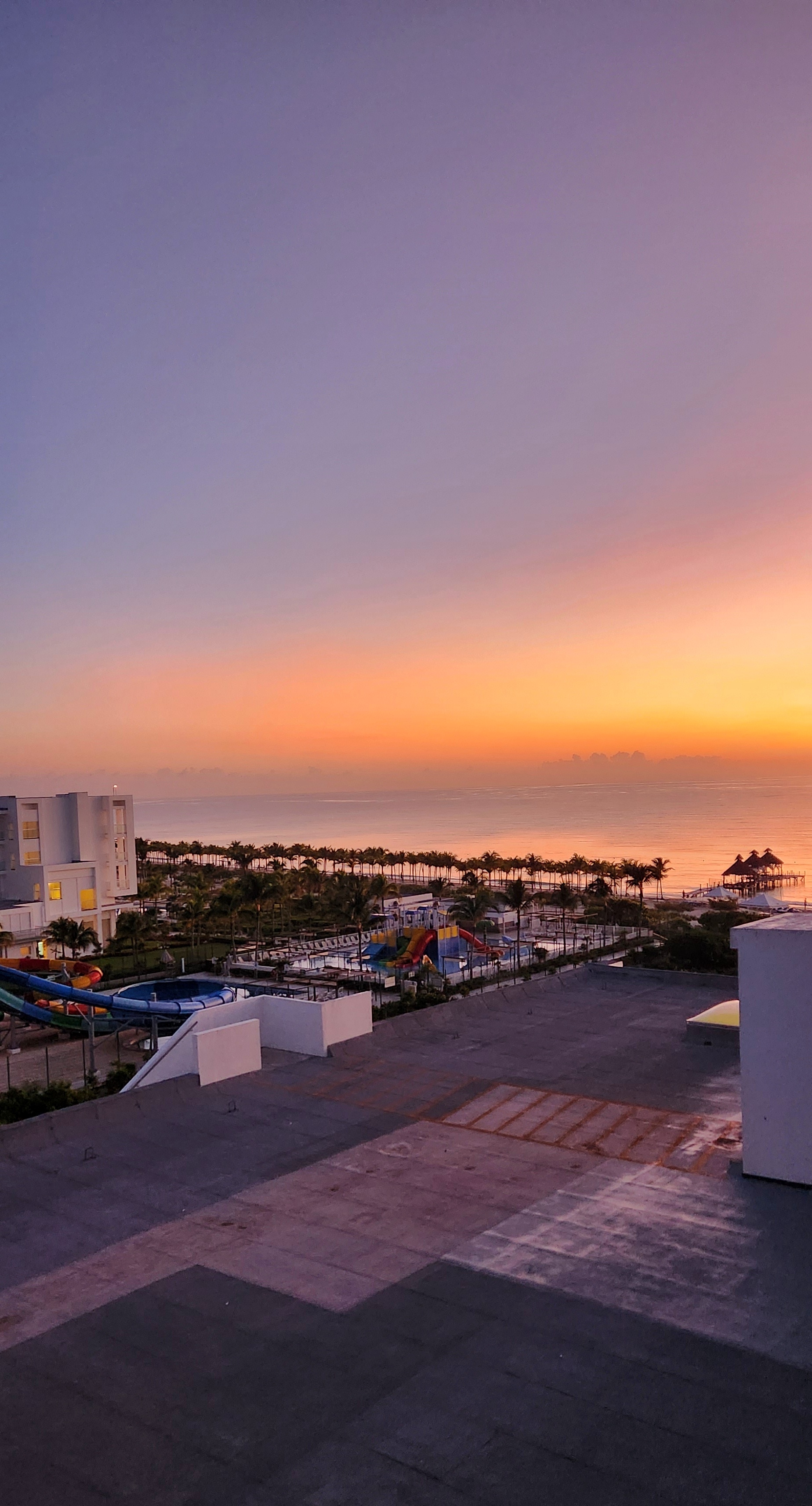 Accommodations: The hotel has 600 rooms in a few low-rise buildings, which gives the feeling of staying at a smaller luxury resort. Our family stayed in a Junior Suite with 2 Full Sized Beds. The room was a great size for our family of 4 and included a sofa, a mini fridge stocked with soft drinks, beer and water, as well as alcoholic beverage dispensers. The bathroom was a good size with double sinks and had a separate room for the toilet. It also had a separate shower and tub. Heads-up, the bathrooms are open concept, if that is a concern, you can ask front desk for a privacy screen. We had a partial view of the Ocean and a direct line of sight to the Waterpark from the balcony. One of our most memorable moments from this trip was watching the sunset in the evening from our balcony, truly a beautiful sight!