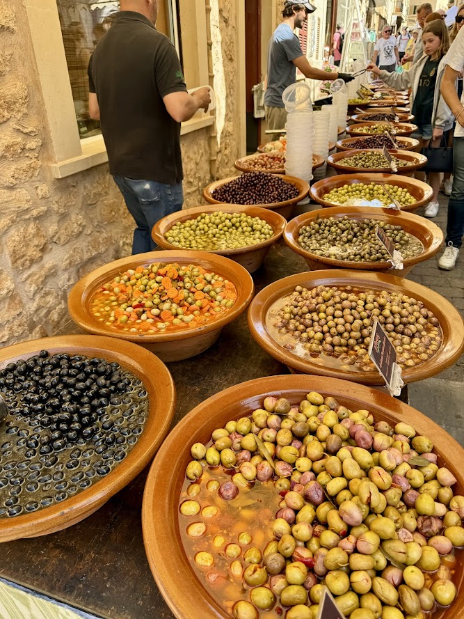 Next, we ventured to the vibrant Santanyí Market on the charming streets surrounding the church. The market’s colours were intoxicating—fresh fruits, handcrafted goods, and vivid textiles that looked like paintings come to life. We picked up some handcrafted goodies, and when at a market in Spain, you must try the olives.