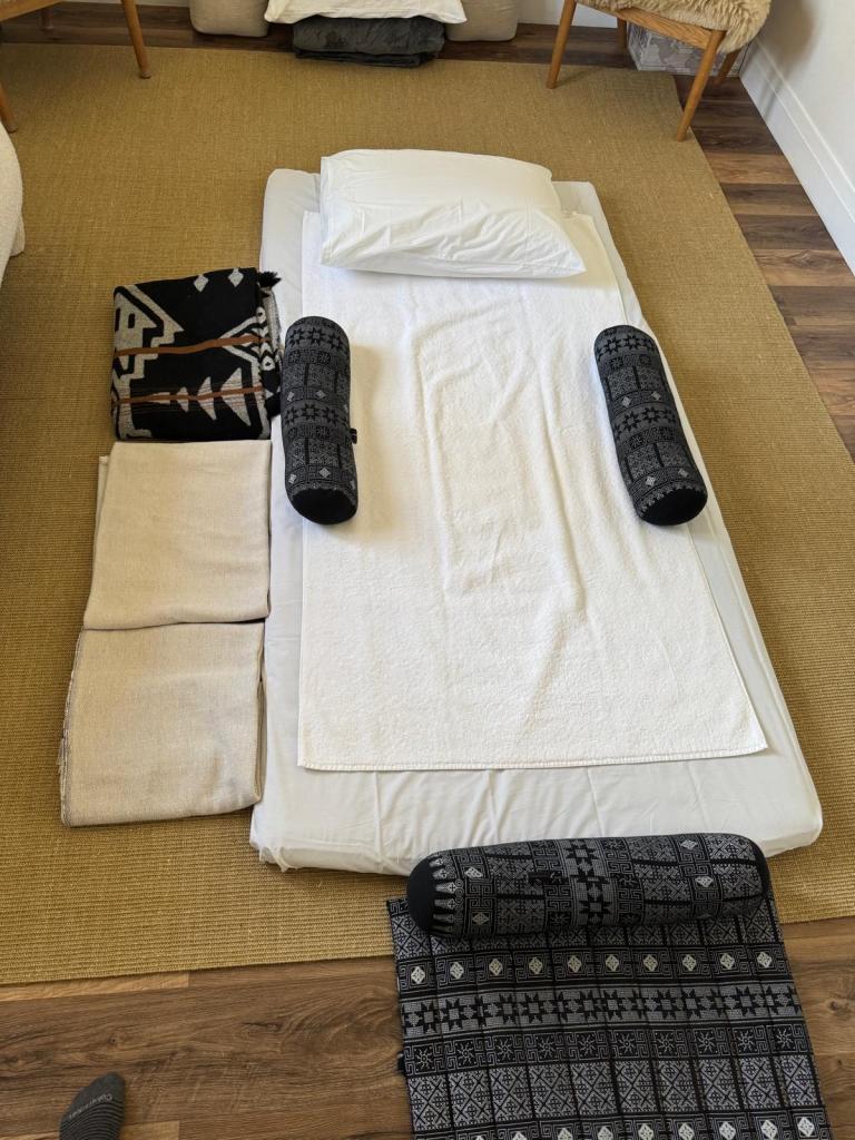 After lunch, I experienced my first Thai massage from Leslie Brennan, which was unlike any massage I have ever had. I lay fully clothed on the floor massage bed, surrounded by pillows and blankets. It wasn’t just relaxing; I experienced a full-body stretch. She pulled and rocked my body while releasing the tension in my shoulders. It was like having a deep tissue massage, a chiropractic treatment, and a yoga stretch all rolled into one. Leslie worked out all my knots, and after the one-hour session, I felt much lighter; my body felt renewed as if the weight of several years of tension just melted away.