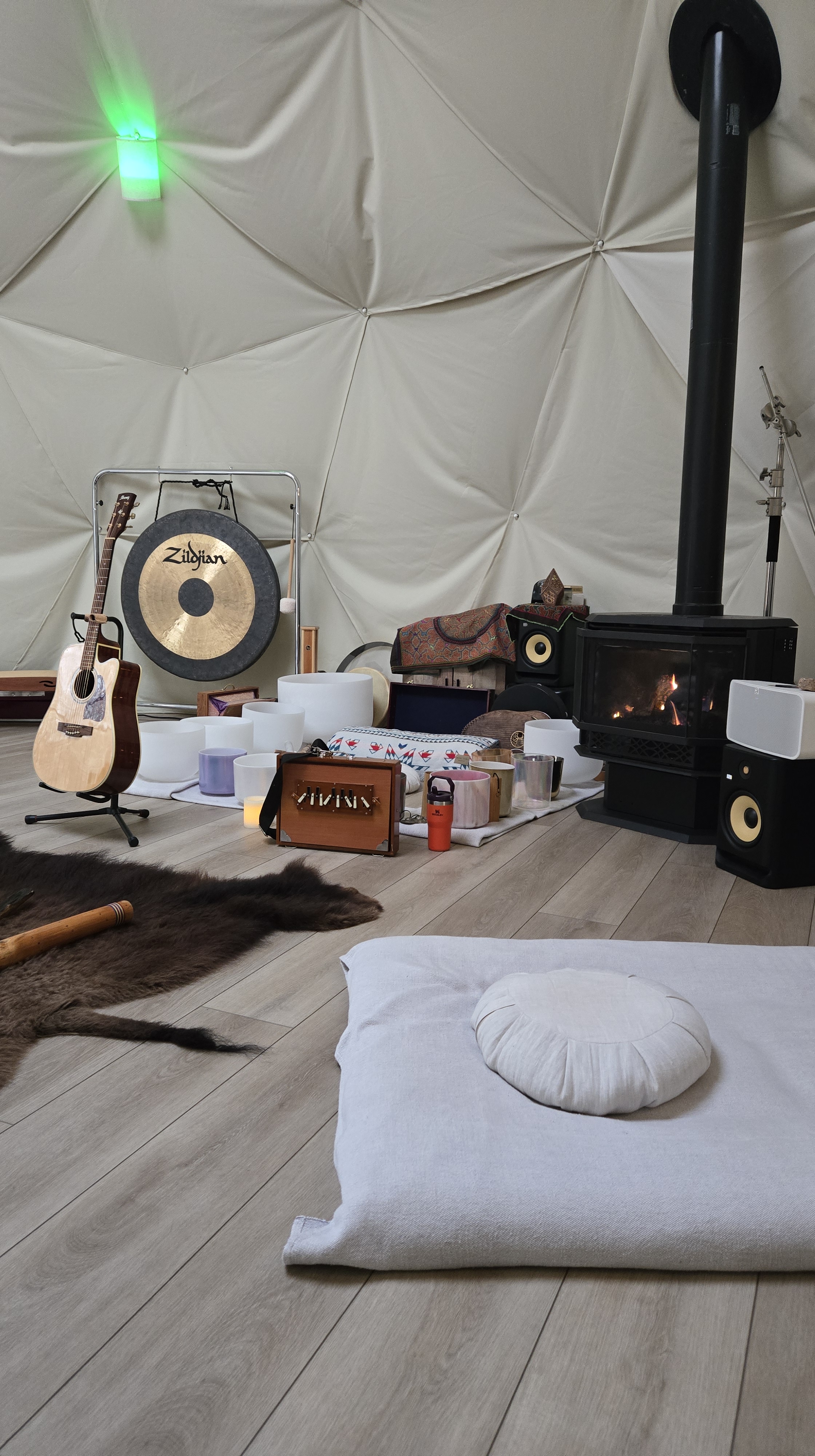 I walked into a beautiful, open-concept giant tent. We each found our place on the floor, laying down with blankets and eye covers. Then came the sounds: bowls, chimes, gongs, ocean drums… instruments from all over the world played by a guru-slash-musician-slash-magician of sorts.